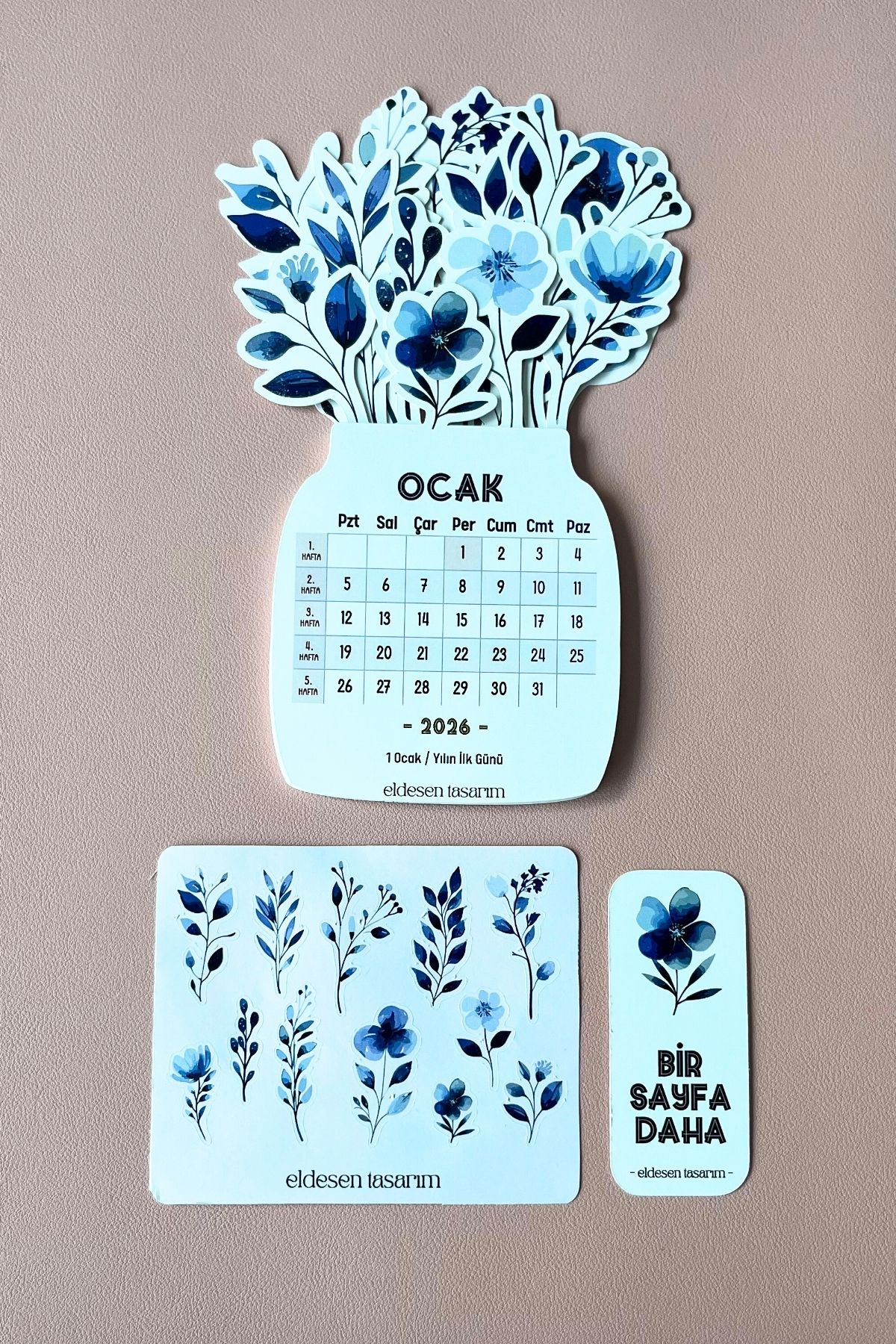 Mavi Çiçek 2026 Kayın Ağacı Standlı Masaüstü Takvim