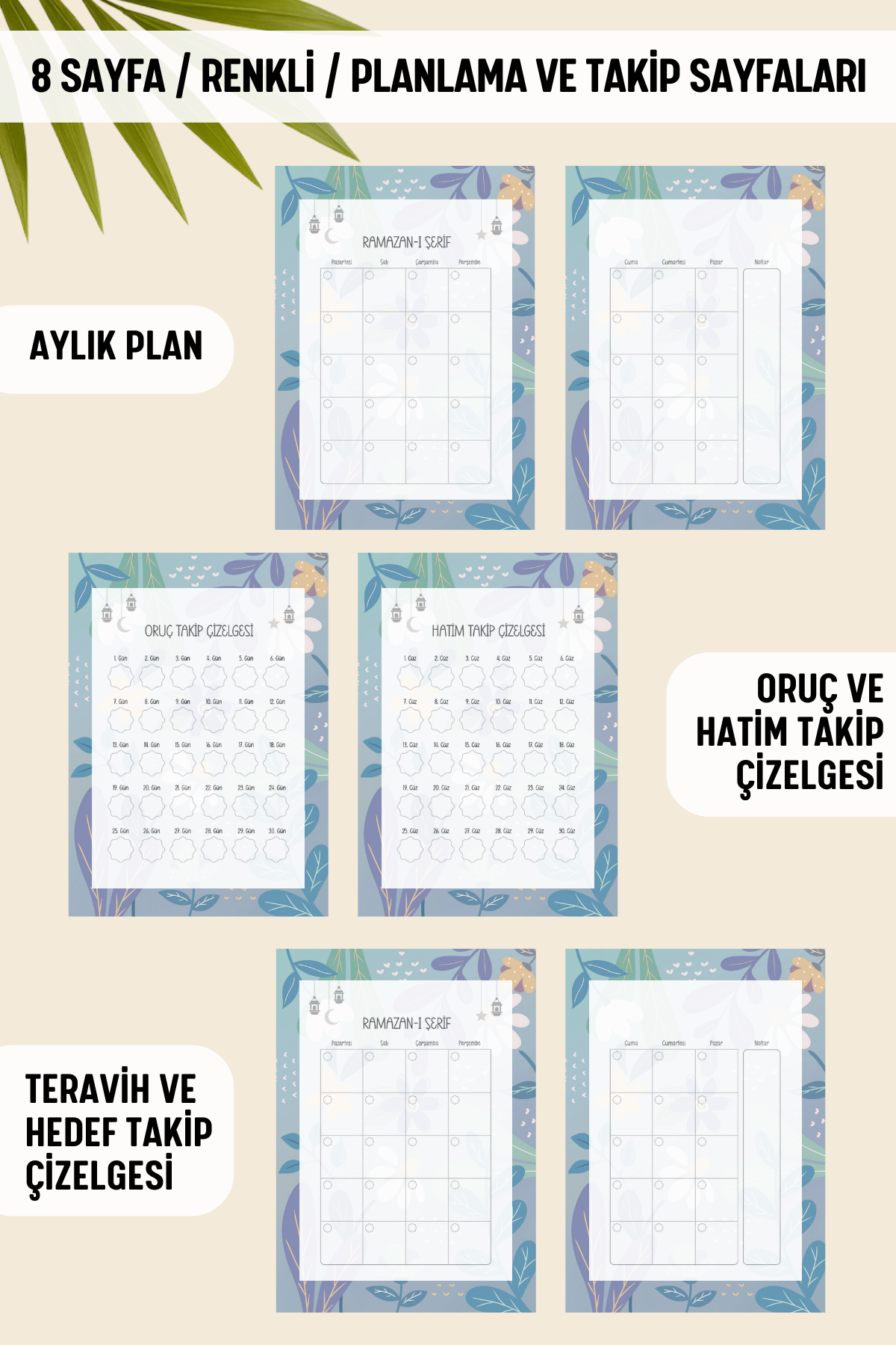 🕌 Aylık planlama sayfası ve Oruç, Hatim, Teravih ve hedef takip çizelgeleri
