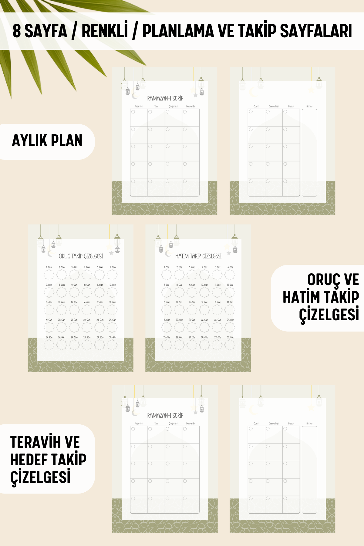 🕌 Aylık planlama sayfası ve Oruç, Hatim, Teravih ve hedef takip çizelgeleri