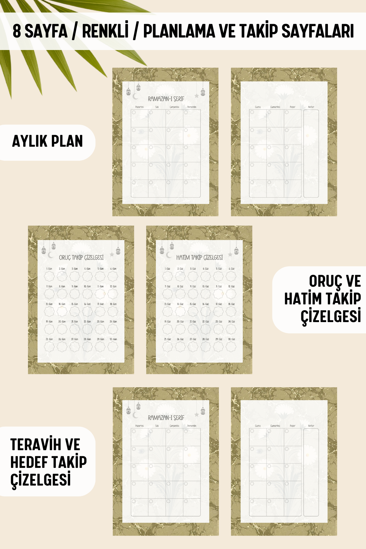 🕌 Aylık planlama sayfası ve Oruç, Hatim, Teravih ve hedef takip çizelgeleri